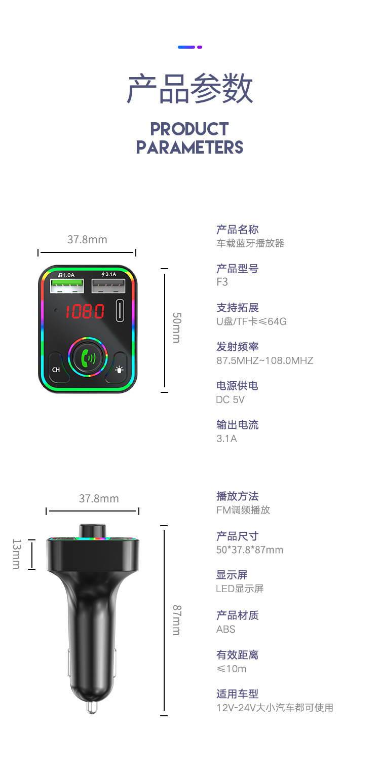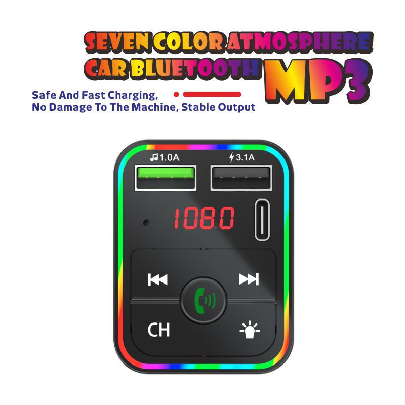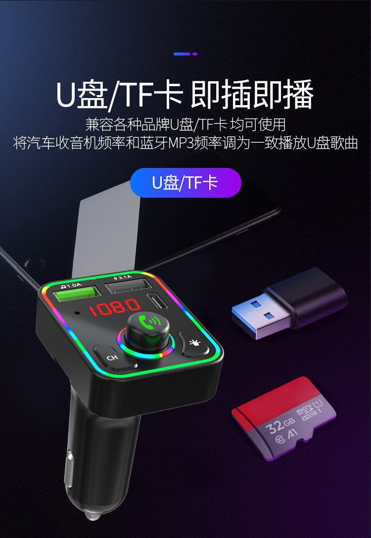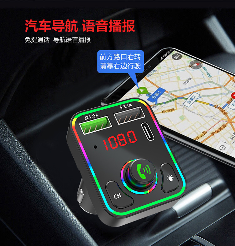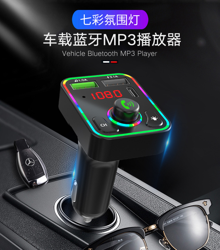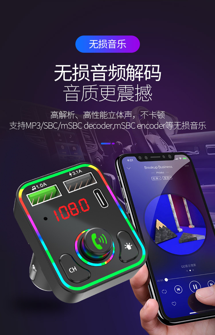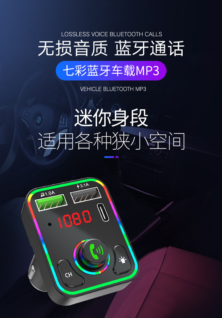 F3车载蓝牙MP3播放器免提氛围灯PD快充适用华为三星小米智能影音