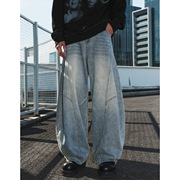 分割结构做旧水洗牛仔裤男秋季新款复古廓形弯刀裤宽松潮牌长裤子
