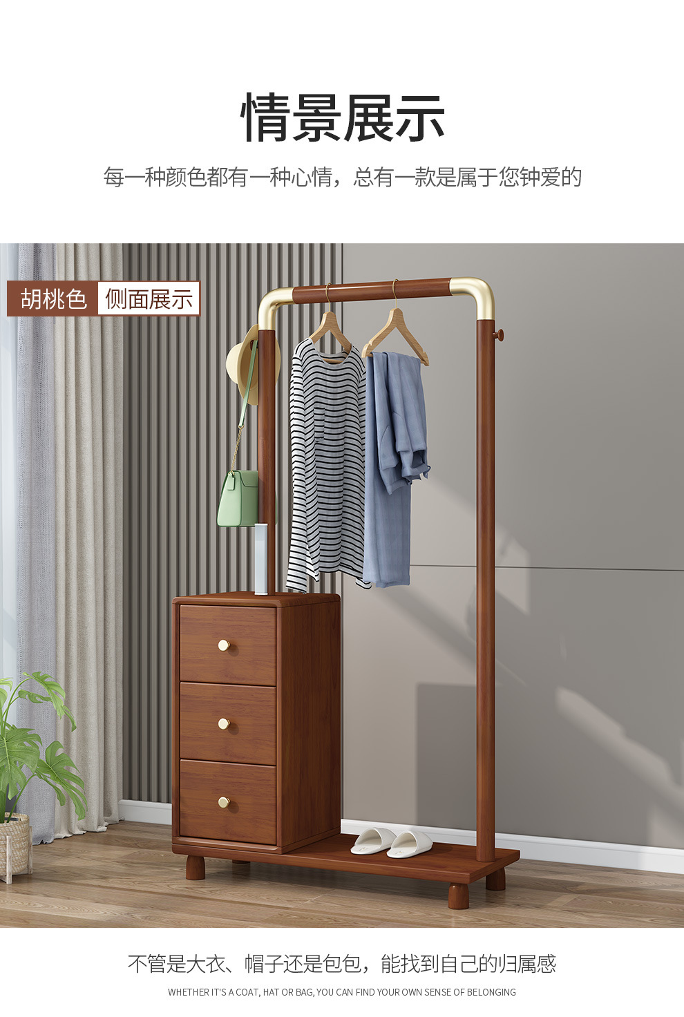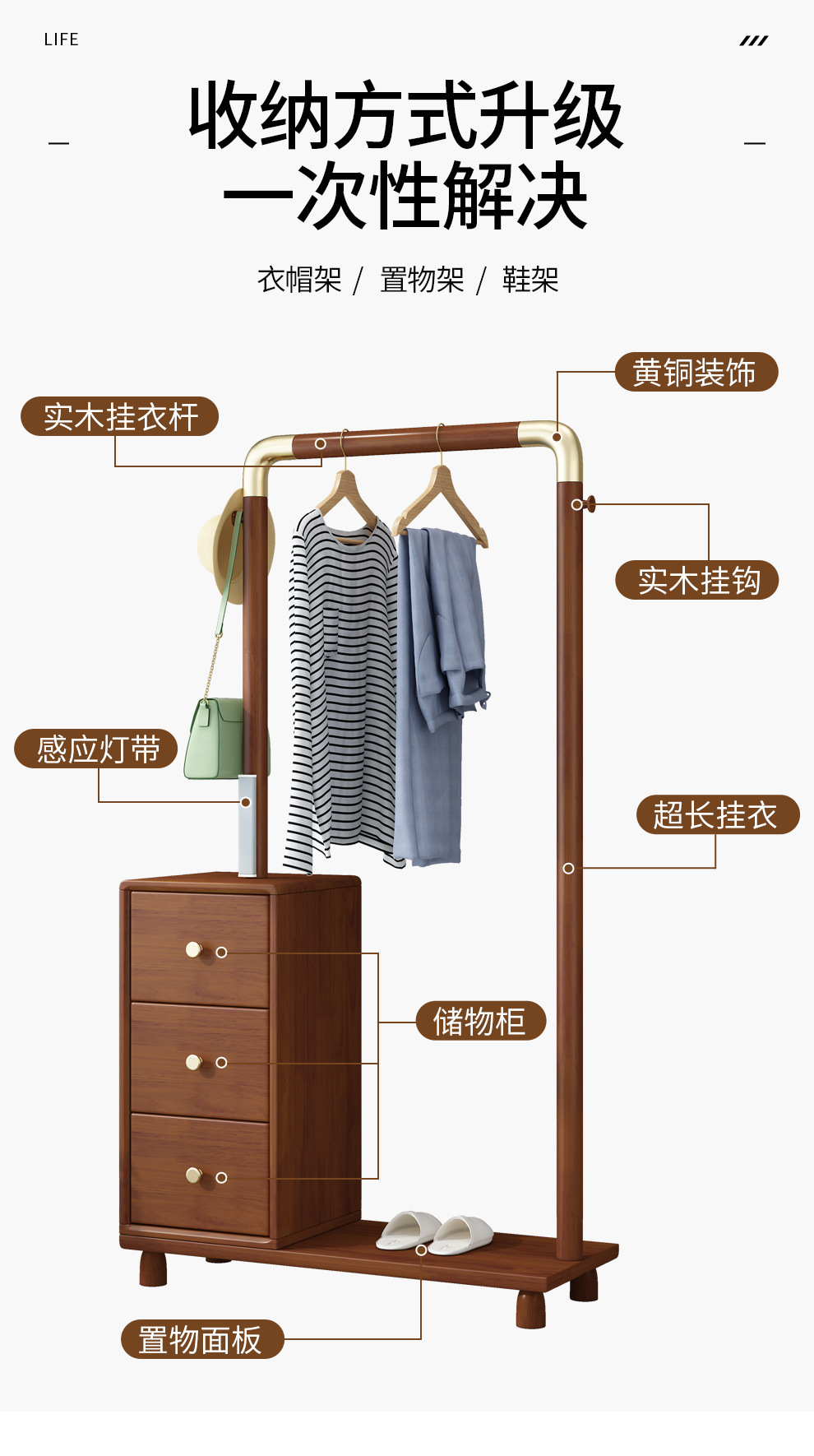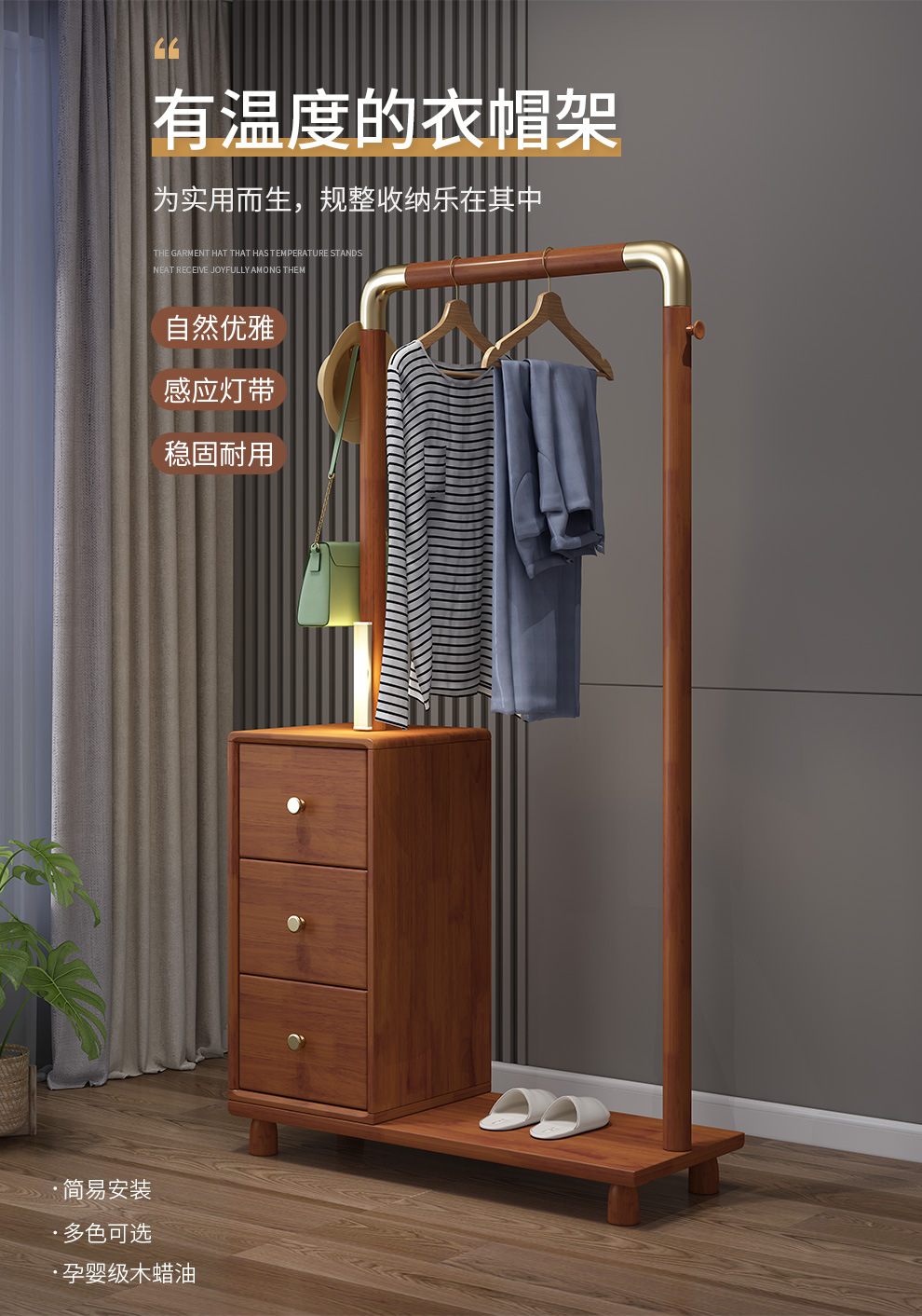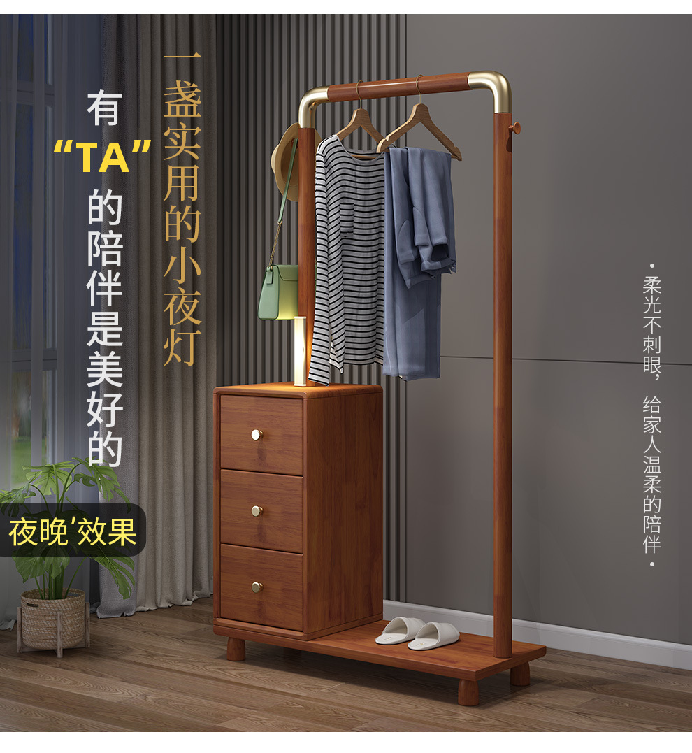 新中式实木衣帽架现代简约带抽屉卧室晾衣架落地储物置物架带夜灯