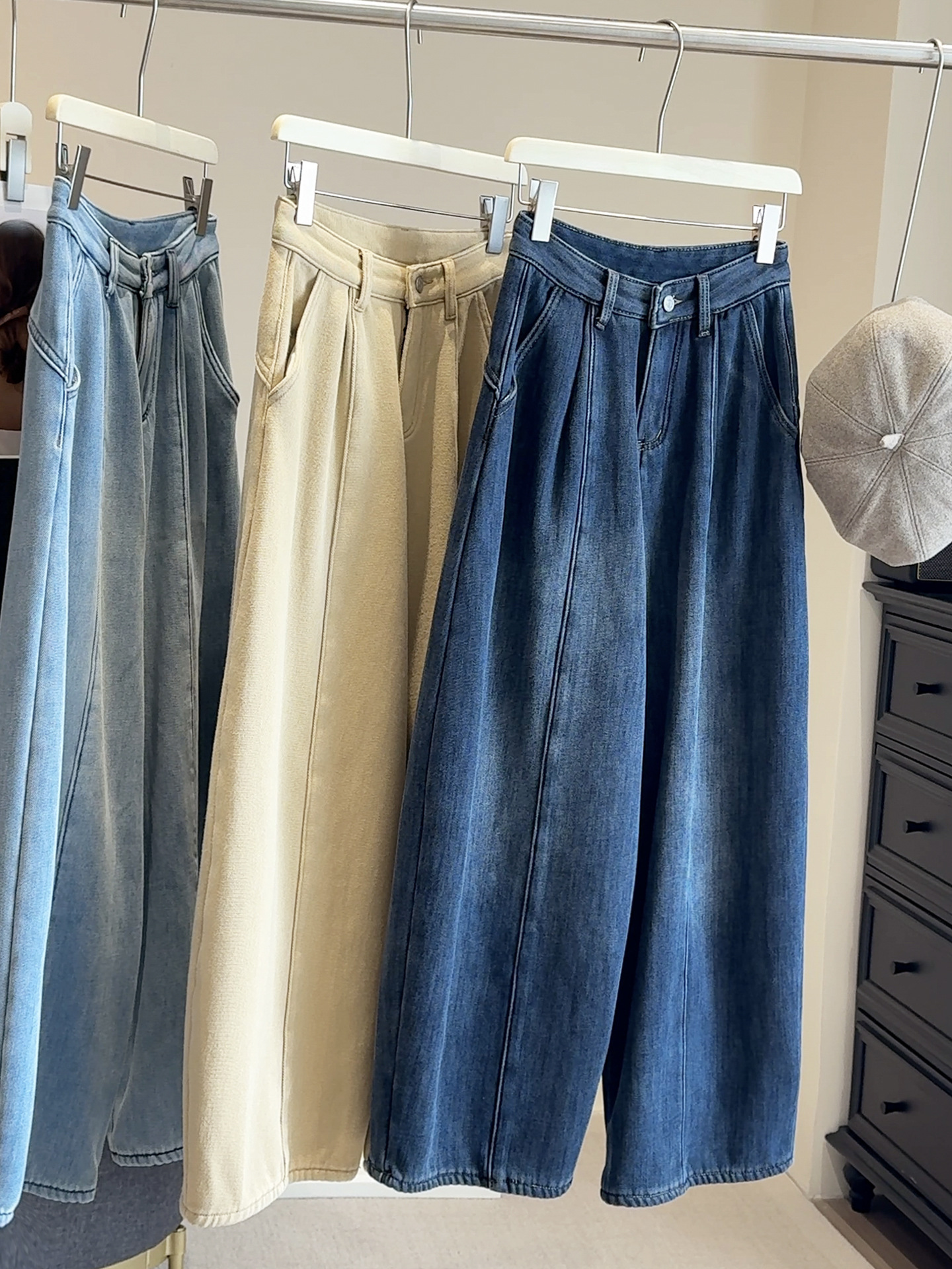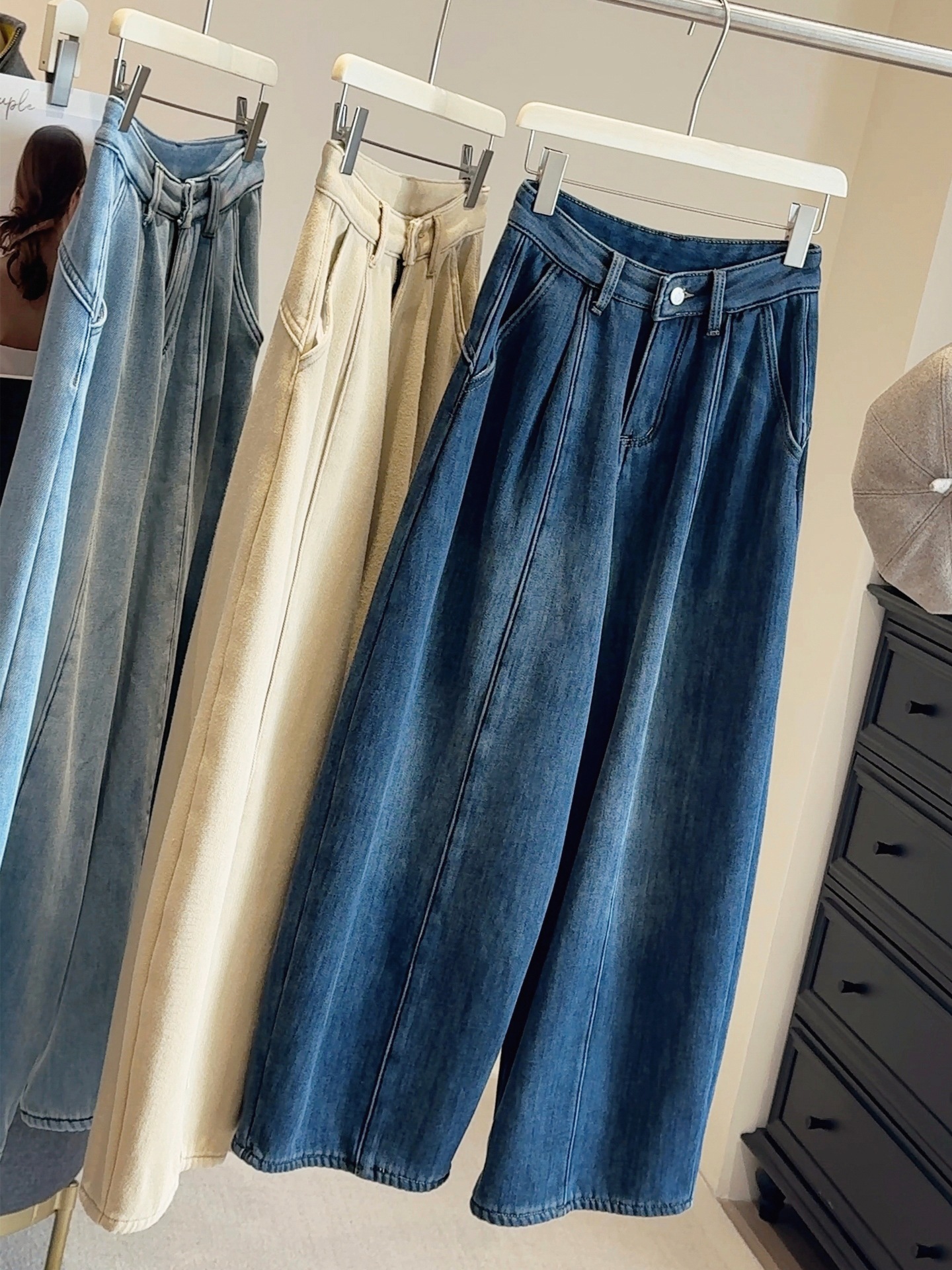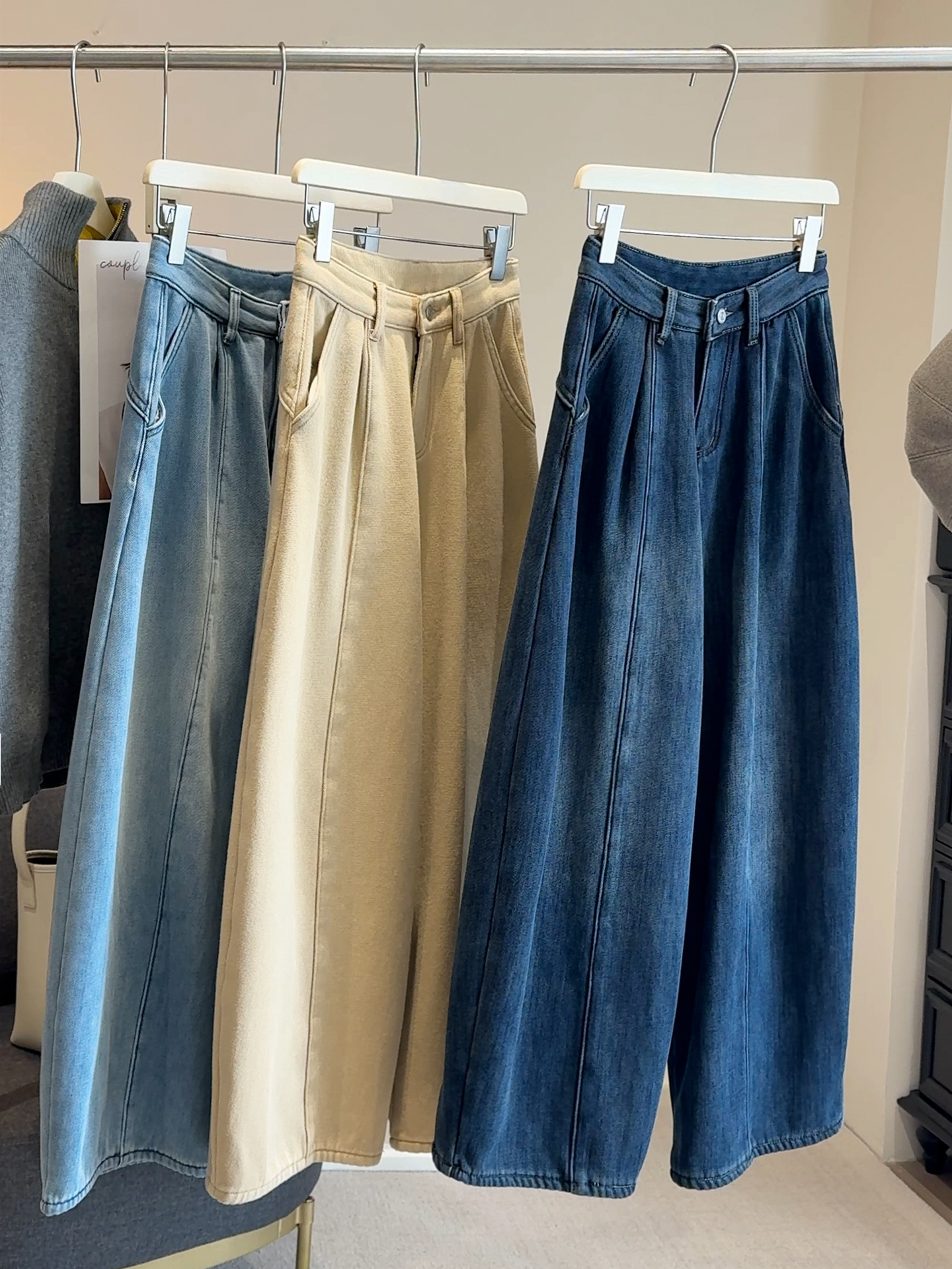 韩系复古加绒阔腿牛仔裤女2025冬新款高腰加厚直筒休闲宽松弯刀裤