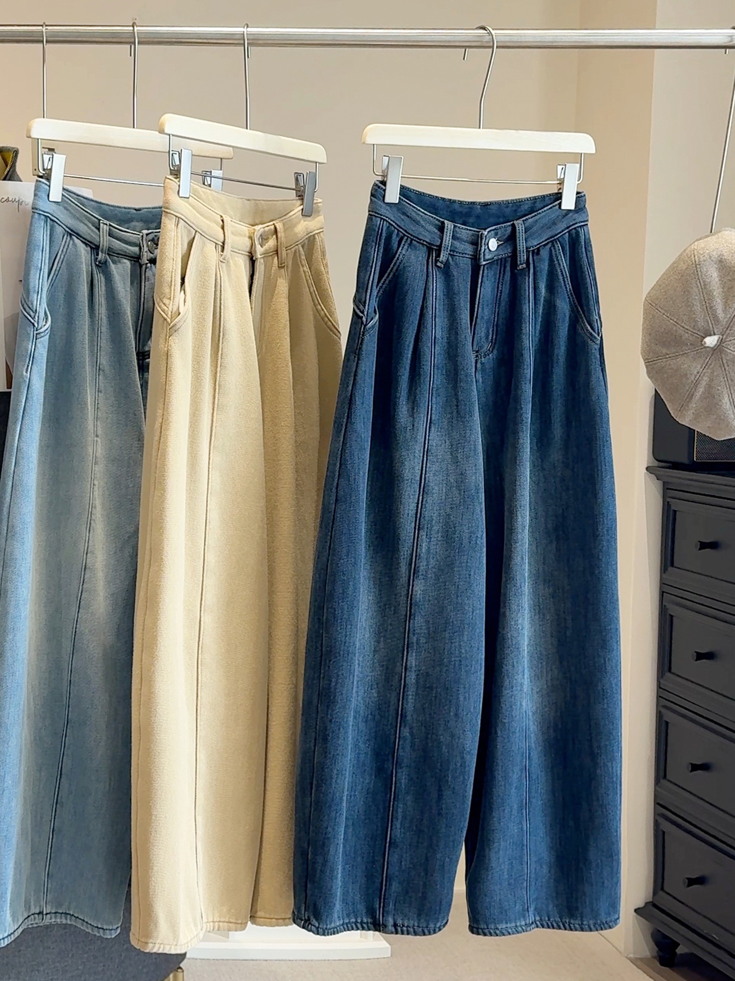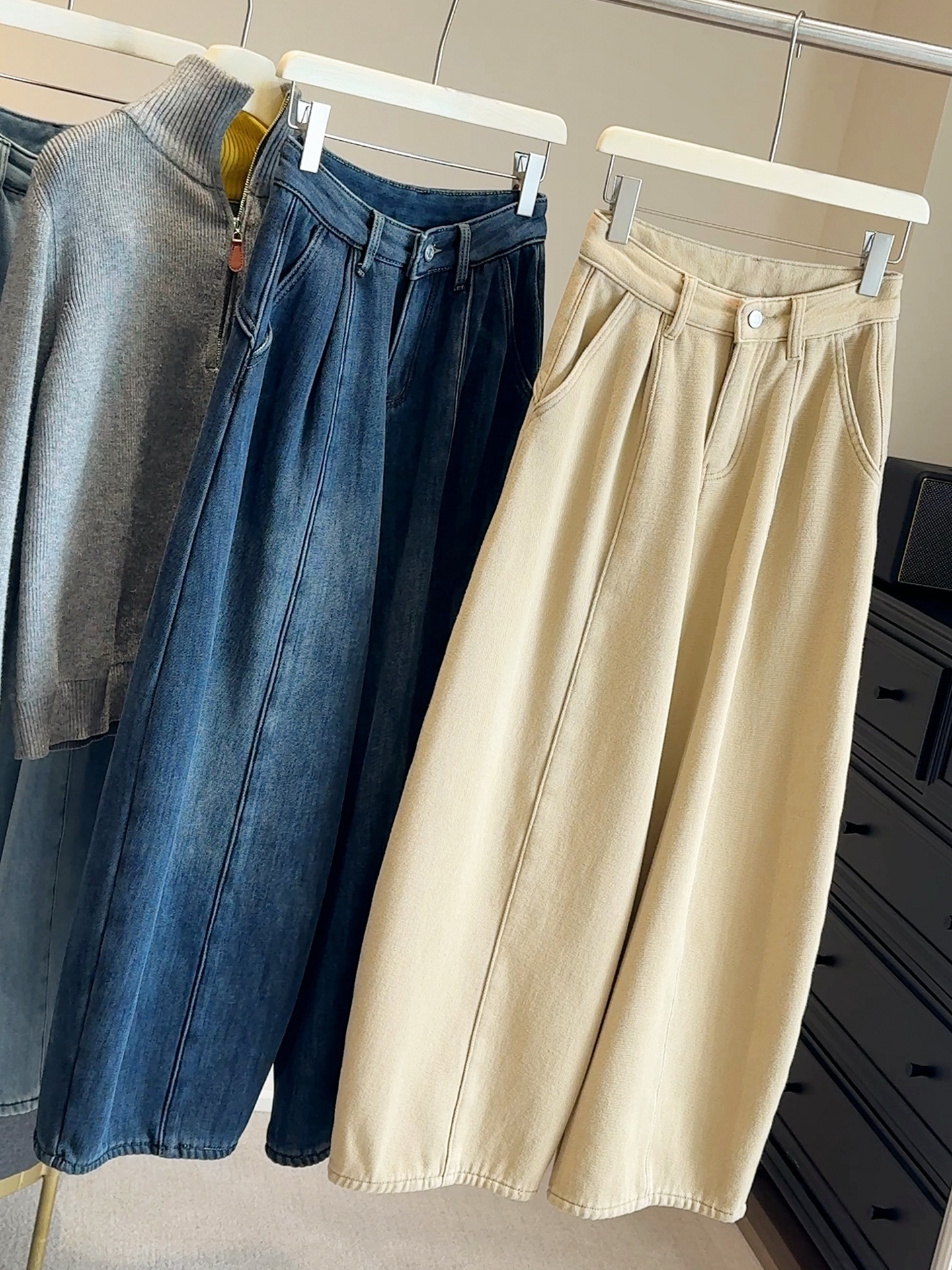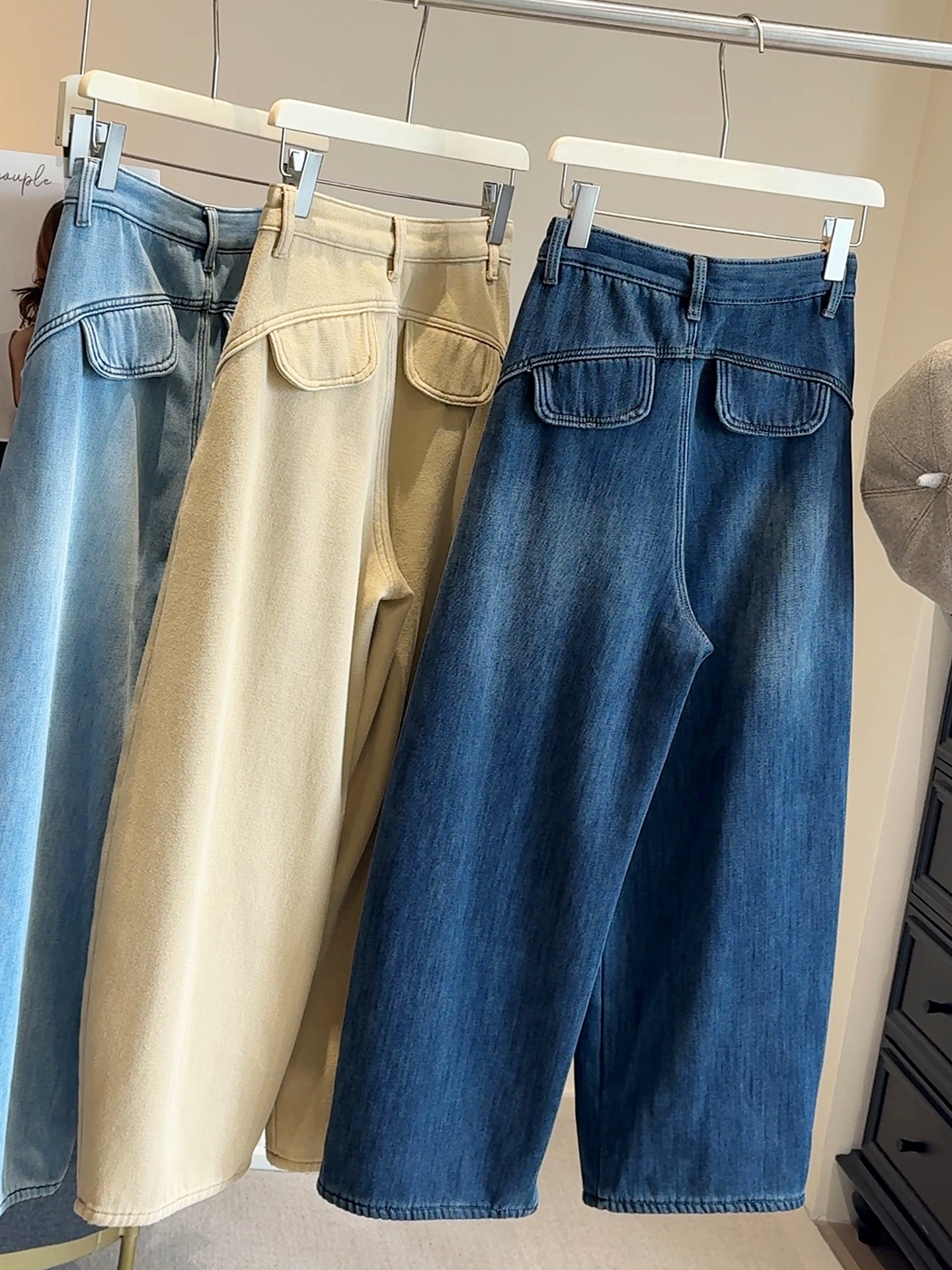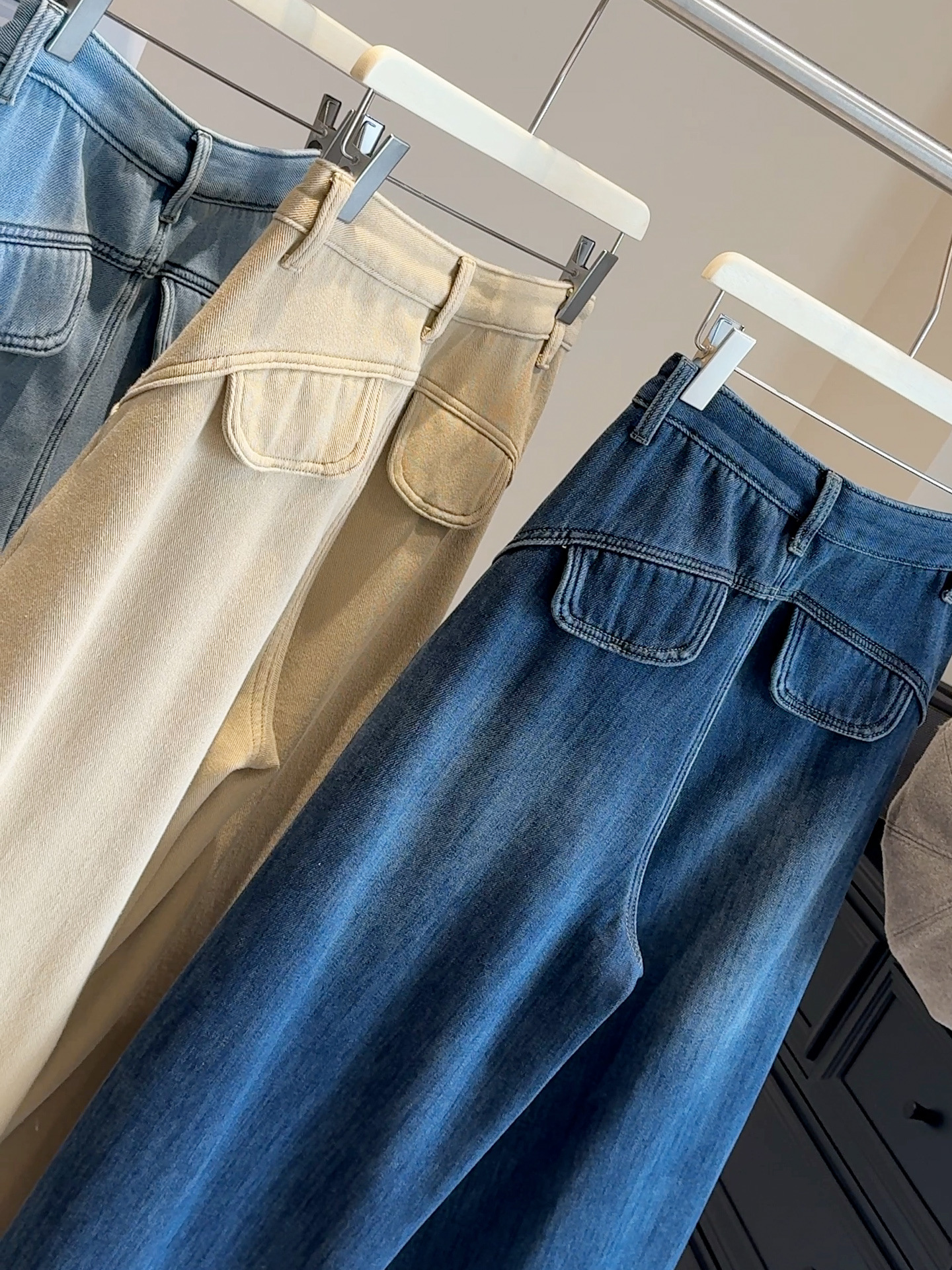 韩系复古加绒阔腿牛仔裤女2025冬新款高腰加厚直筒休闲宽松弯刀裤