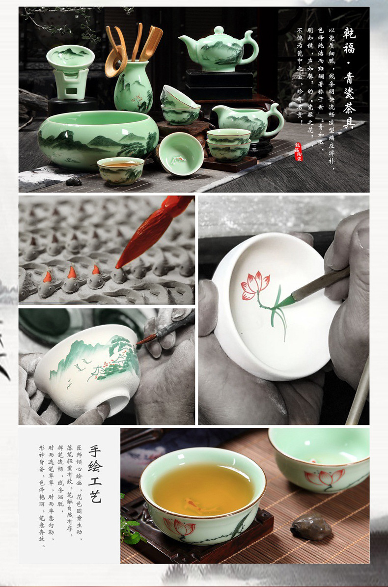 乾福盖碗青瓷茶杯套装陶瓷手绘山水荷花鲤鱼茶碗中式主人品茗杯